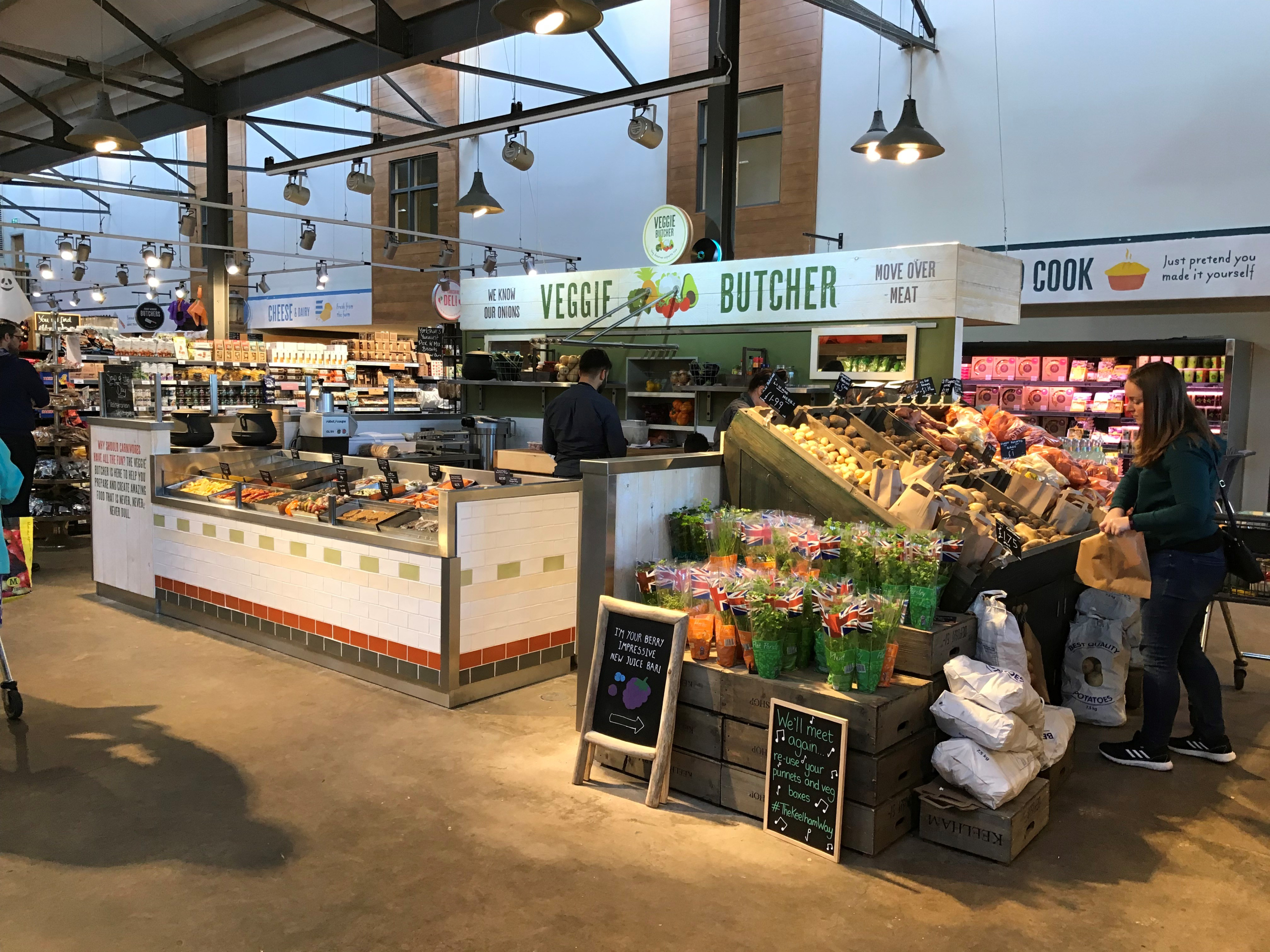 A Skipton farm shop with metro tiled fronted counter to help enhance and differentiate the butcher feel of their in-shop veggie butcher area.