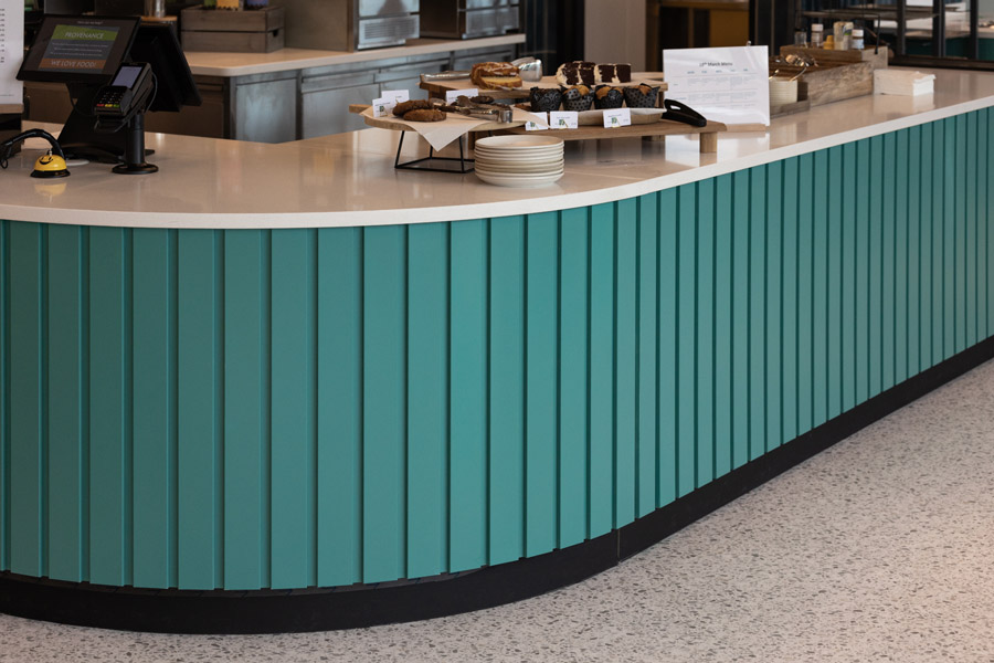 Slatted counters continue to be popular and come in all different configurations and colours. Showing is a fully painted regular slat design and a wood veneered irregular version, both on curved counters, both produced and installed by Holmes. Other materials such as laminate or solid timber can also be used for slatting. Any questions on materials, finishes, or manufacture details just give us a call.